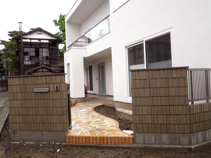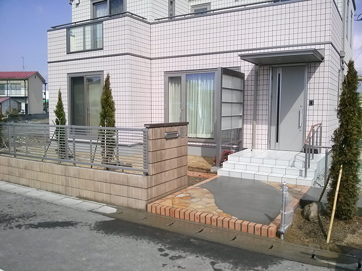 建物に合わせたお色で目隠しフェンスを据え付け、お家周りには化粧ブロック三段にフェンスを取り付け、玄関前はレンガと石英岩で仕上げ、植栽はうるさくなく全体的にやわらかい印象に。