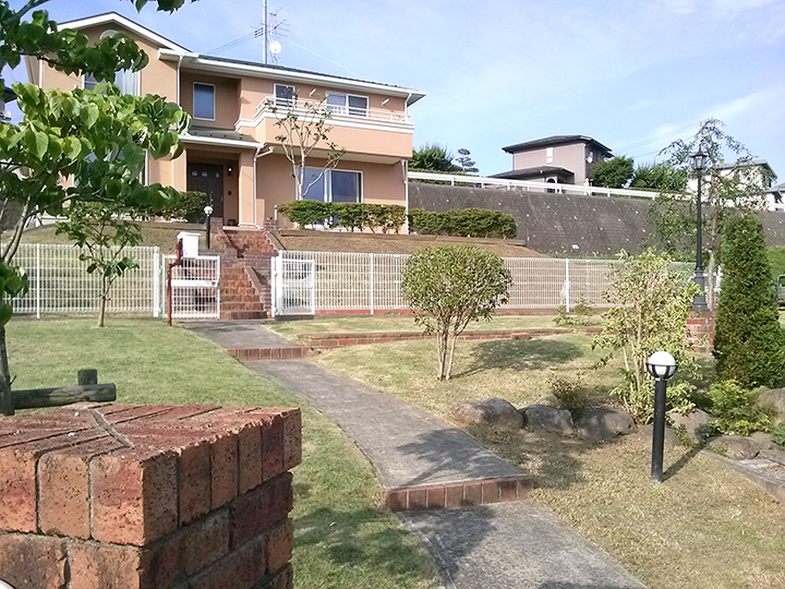 門から玄関へ続く長いアプローチまでにある芝と階段脇にある法面の雑草を除草してすっきりとした外観になりました。