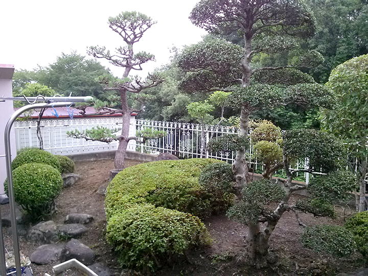 立派な松が数本と、他に多種類の樹木が広い敷地内にあり、大人数をかけ剪定し、お庭に明るさが戻りました。